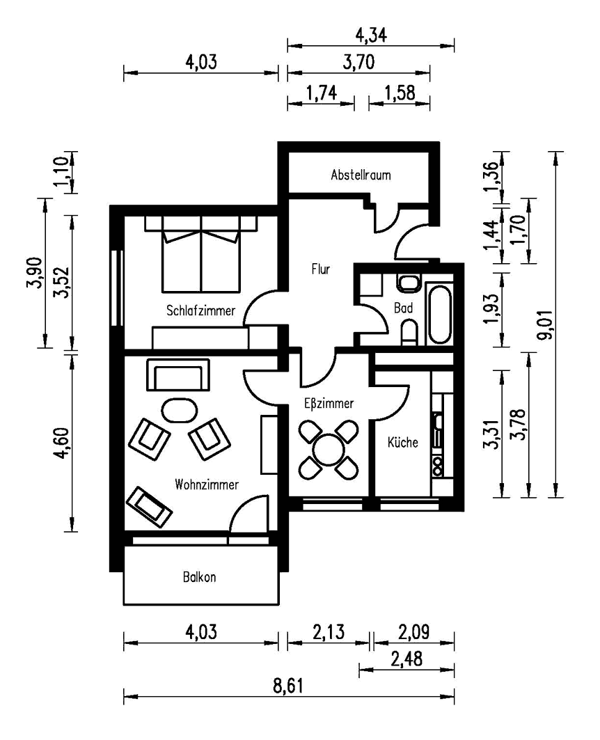 2 Zimmer, Küche, Diele, Bad, Esszimmer, Abstellraum und Balkon.
